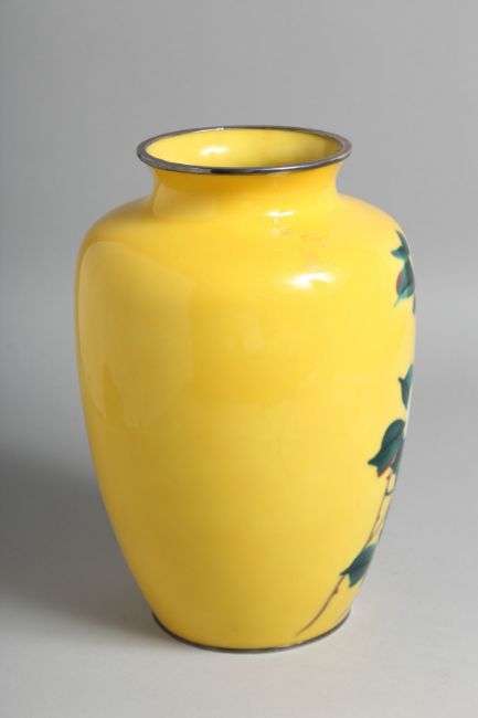 A JAPANESE YELLOW GROUND CLOISONNE VASE, decorated with floral spray. 24cm high