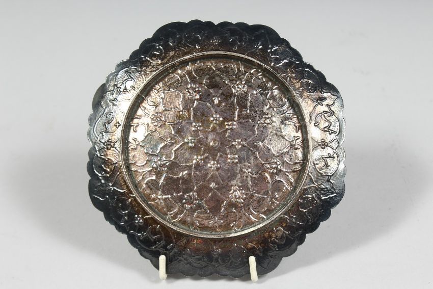 A PERSIAN ENAMELLED SILVER DISH, the embossed and chased dish with foliate enamelled decoration, 15.5cm diameter.