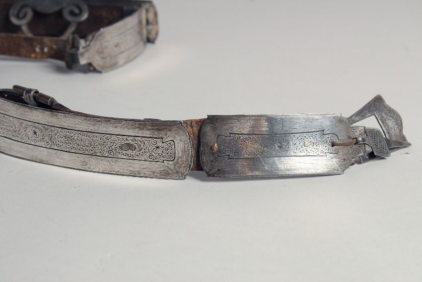 A VERY FINE 17TH/18TH CENTURY TIBETAN SILVER AND GOLD INLAID STEEL BELT, 81cm long.