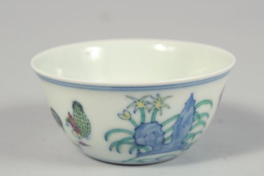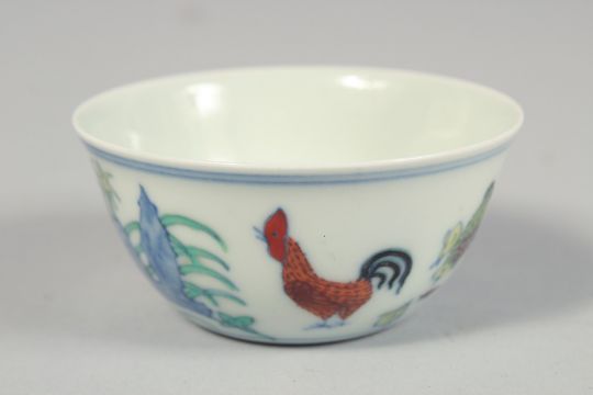 A CHINESE PORCELAIN CHICKEN CUP, the base with six-character mark, 8cm diameter.
