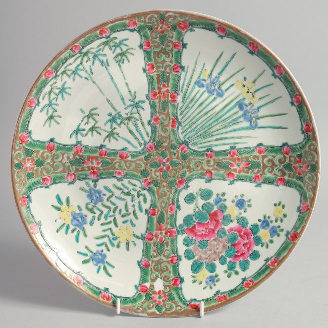 A PAIR OF CHINESE CANTON FAMILLE ROSE PORCELAIN PLATES, each painted with panels of native flora, each with painted red inscription to base and impressed mark, 30.5cm diameter.