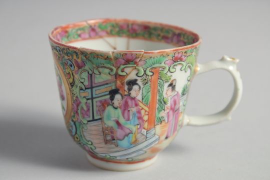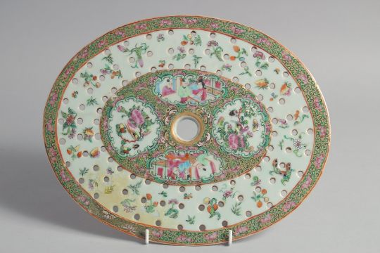 A COLLECTION OF FOUR CHINESE CANTON FAMILLE ROSE PORCELAIN PIECES, comprising a twin handle sugar bowl, a teacup (af), an egg cup (loss to rim), and an oval strainer, (4).