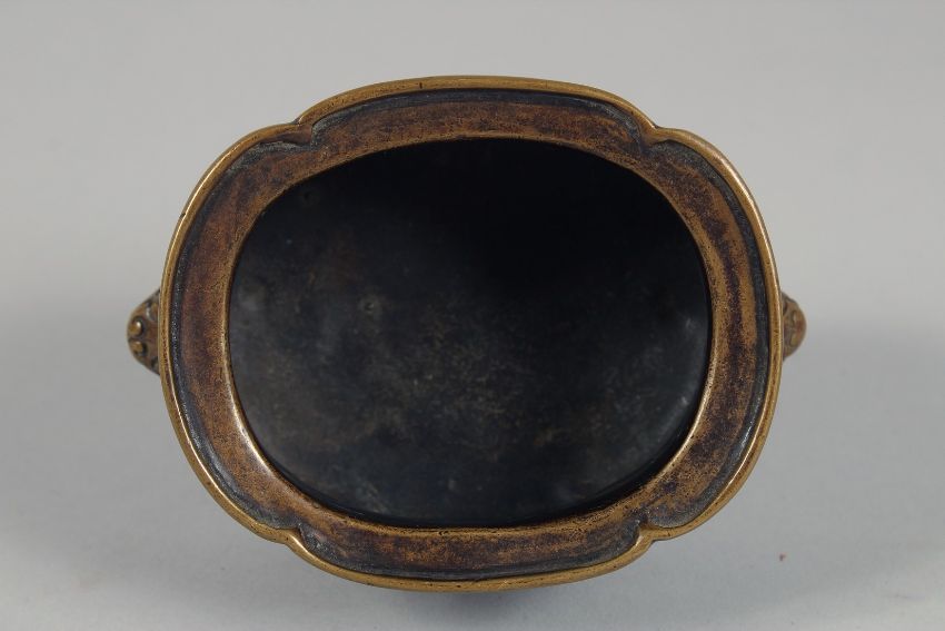 A SMALL CHINESE BRONZE CENSER, with lion dog handles and raised on three bamboo branch formed feet, 12.5cm wide.