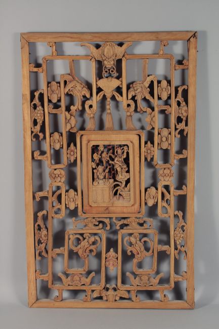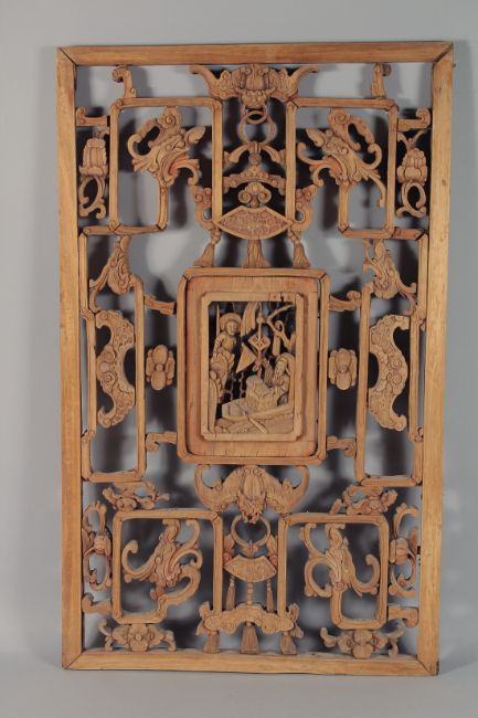 A PAIR OF LARGE CHINESE CARVED WOOD PANELS, each with a central panel of figures surrounded by carved and pierced foliate motifs and bat-like winged beasts, each 95cm x 59cm.