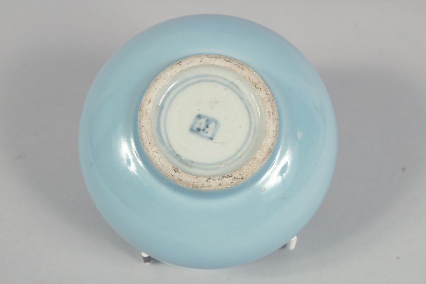 A SMALL CHINESE POWDER BLUE GLAZE BOWL, with mark to base, 10cm diameter.