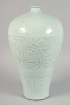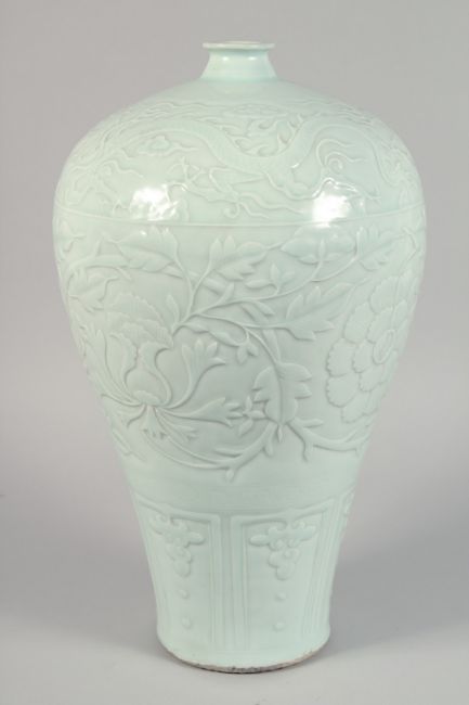 A VERY LARGE CELADON GLAZE PORCELAIN MEIPING VASE, the body with carved decoration depicting large flower heads and dragons. 45cm high