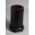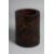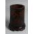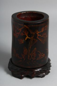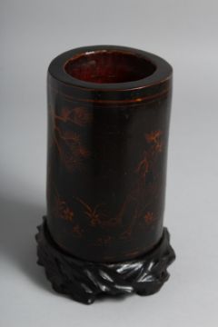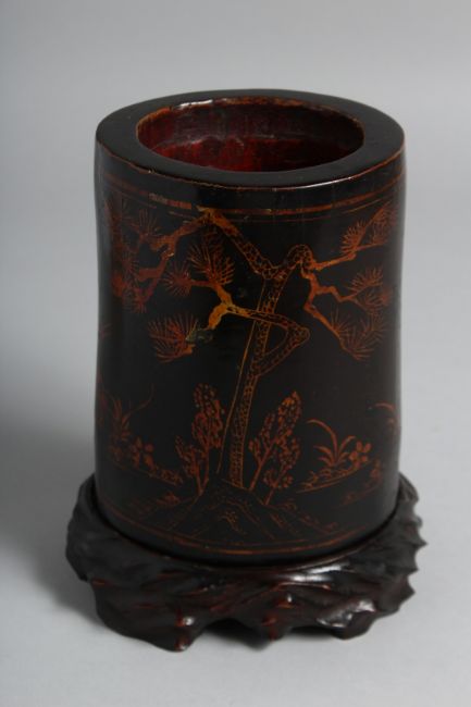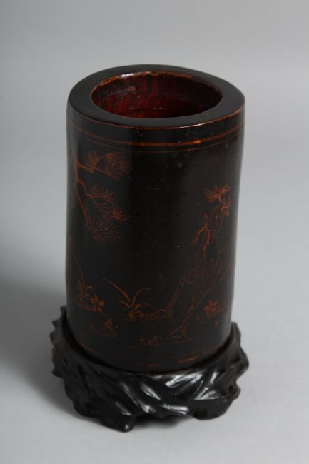 A CHINESE LACQUERED BAMBOO BRUSH POT on a fitted hardwood stand, decorated with deer and crane. Overall height on stand 18.5cm high