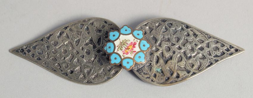 A RARE EARLY 18TH CENTURY TURKISH OTTOMAN SILVER AND SULAIMANIA ENAMEL BELT BUCKLE, 13.5cm wide.