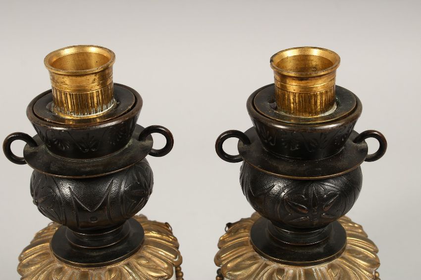 A VERY GOOD PAIR OF REGENCY, BRONZE AND MARBLE TWO-HANDLED CASSOULETS ON STANDS hung with rope.
