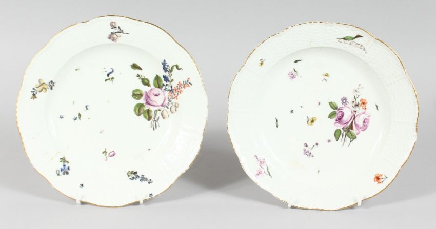 A GOOD PAIR OF MEISSEN CIRCULAR PLATES sprigged and painted with flowers.
