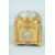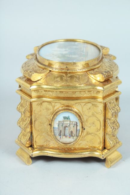 A SUPERB GILT CASKET with engraved decoration and silk lined interior, mounted with famous scenes and buildings.