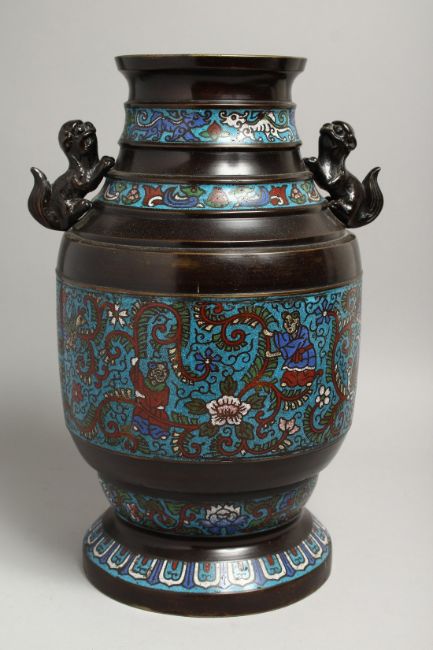 A LARGE CHINESE BRONZE AND CLOISONNE ENAMEL VASE with lion handles.