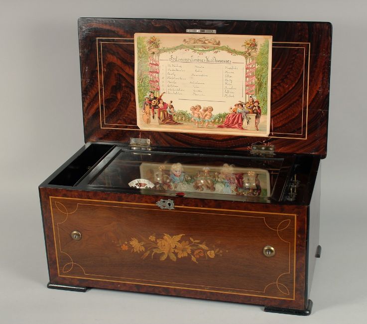 JOHN MANGER & CO., A VERY GOOD SWISS MUSICAL BOX playing eight airs on six bells with two automation dancers.
