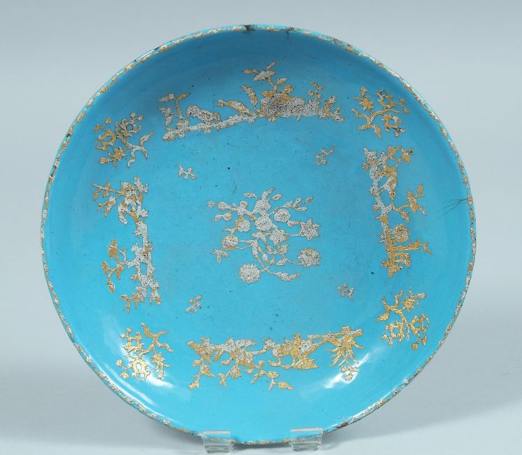 A 19TH CENTURY FRENCH ENAMEL CIRCULAR DISH with gilt decoration.