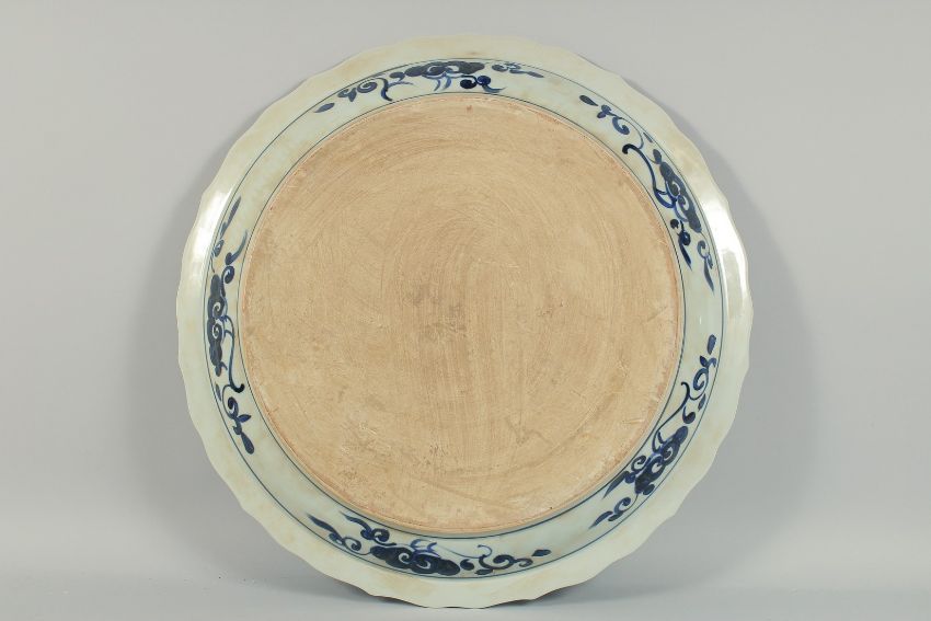 A LARGE CHINESE BLUE AND WHITE MING DESIGN CIRCULAR PATTERN decorated with a fish and flower handles.