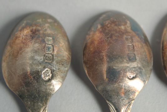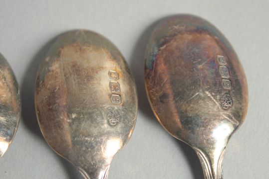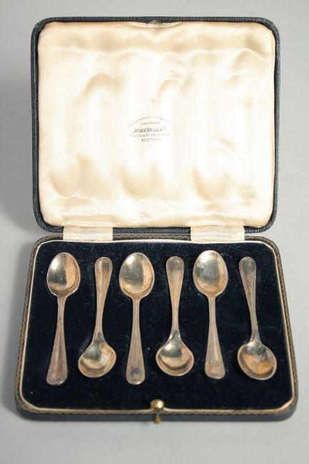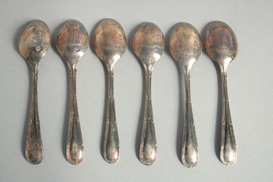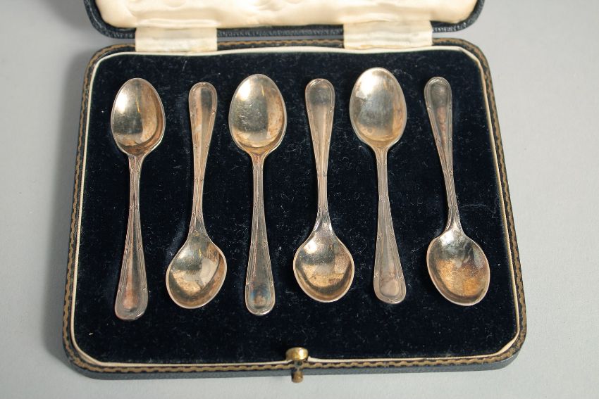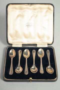 A SET OF SIX SILVER COFFEE SPOONS in a fitted case.