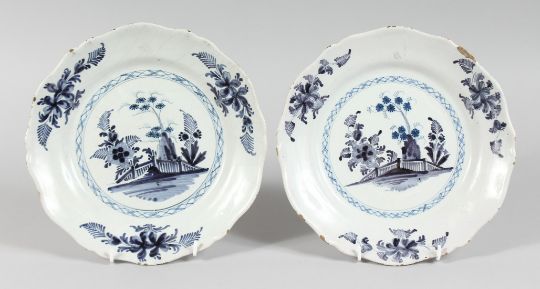 A PAIR OF 19TH CENTURY TIN GLAZE PLATES with Fence pattern etc.