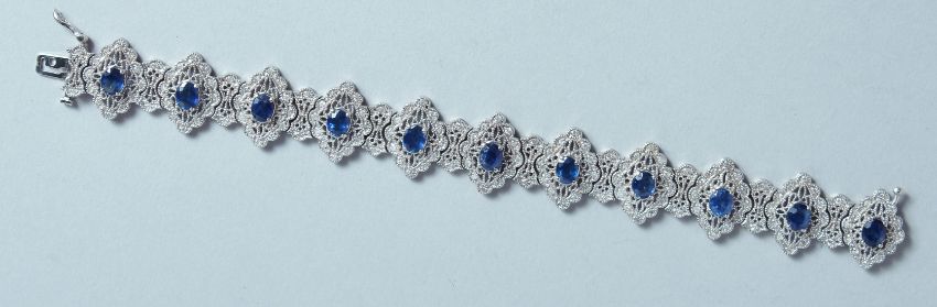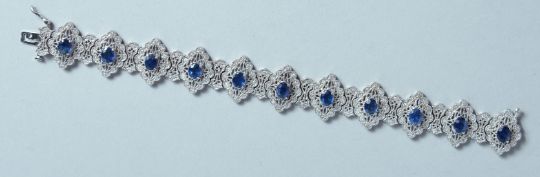 A GOOD WHITE GOLD DIAMOND AND SAPPHIRE BRACELET set with eleven sapphires.