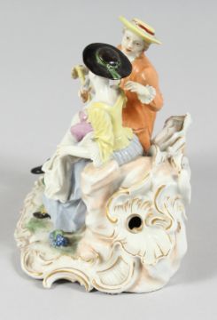 A GOOD FURSTENBERG PORCELAIN GROUP of a young man and girl siting on a bench, a basket of grapes at their feet.