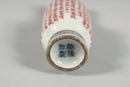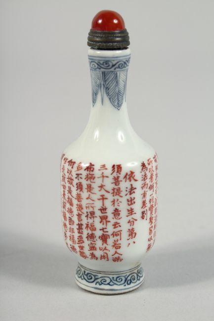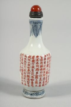 A CHINESE PORCELAIN SNUFF BOTTLE AND STOPPER, the body with calligraphy, the stopper inset with a stone, possibly agate.