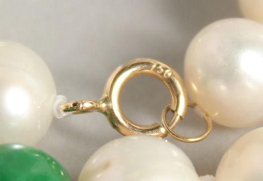 A STRING OF APPLE JADE AND PEARL NECKLACE.