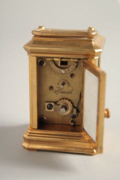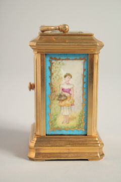 A MINIATURE SEVRES STYLE CARRIAGE CLOCK with painted dial