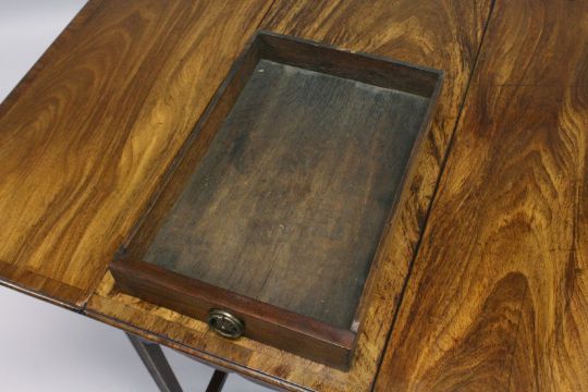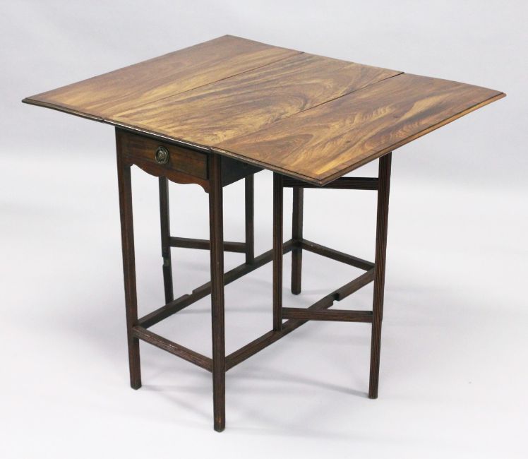 A VERY GOOD GEORGE III MAHOGANY DROP FLAP TABLE with cross banded top, single end drawer, gate leg action on square reeded legs.