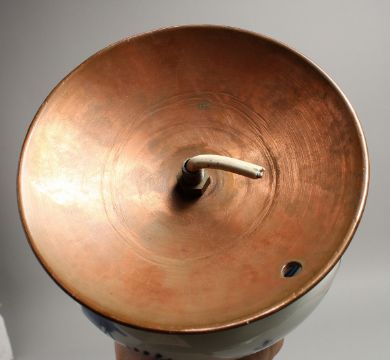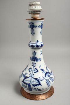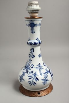 A 19TH CENTURY MEISSEN BLUE AND WHITE ONION PATTERN LAMP.