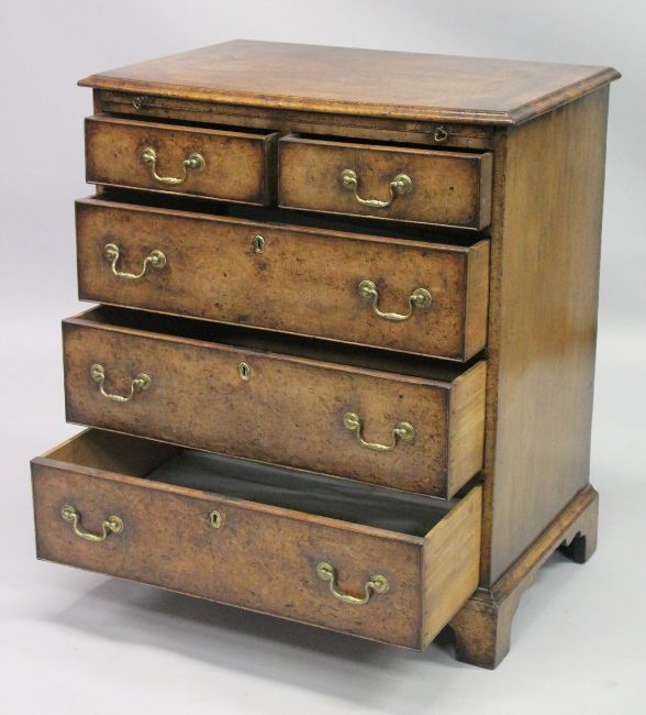 A GOOD 18TH CENTURY STYLE WALNUT CHEST OF DRAWERS with a moulded top, brushing slide, two short and three long graduated drawers on bracket feet.