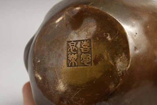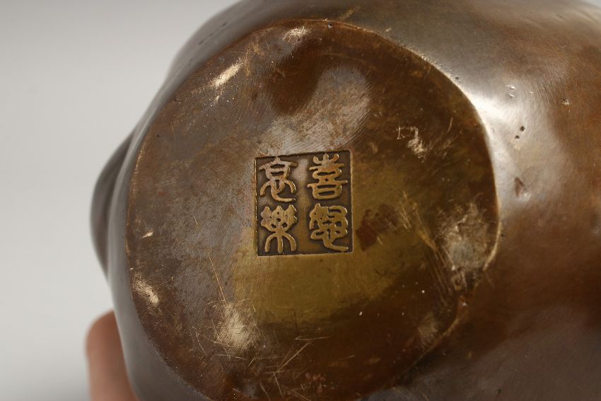 A LARGE CHINESE BRONZE FOUR FACED BUDDHA HEAD.