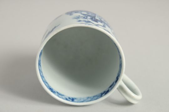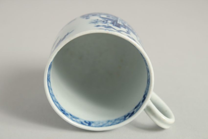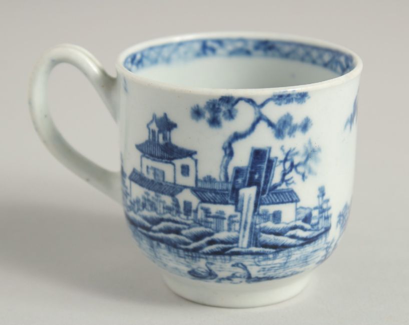 AN 18TH CENTURY WORCESTER EARLY PRINTED COFFEE CUP in under glaze blue, with the Plantation pattern with swimming swans, verso, ex-King Collection.