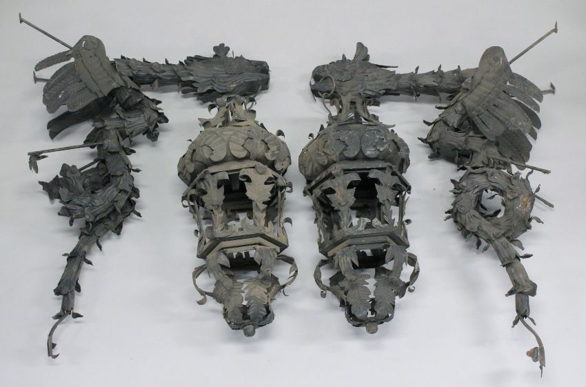AN UNUSUAL PAIR OF WROUGHT IRON SCULPTURE LANTERNS with dragon supports.