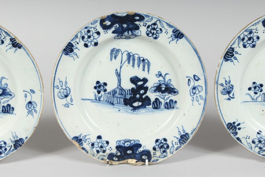 THREE 19TH CENTURY TIN GLAZE PLATES with Chinese design.