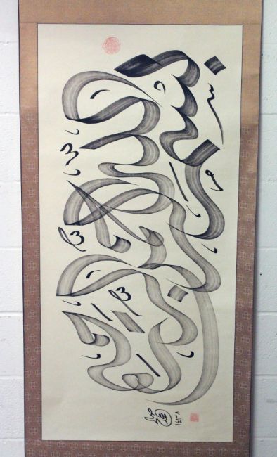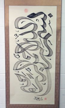A VERY LARGE ISLAMIC CALLIGRAPHIC HANGING SCROLL.