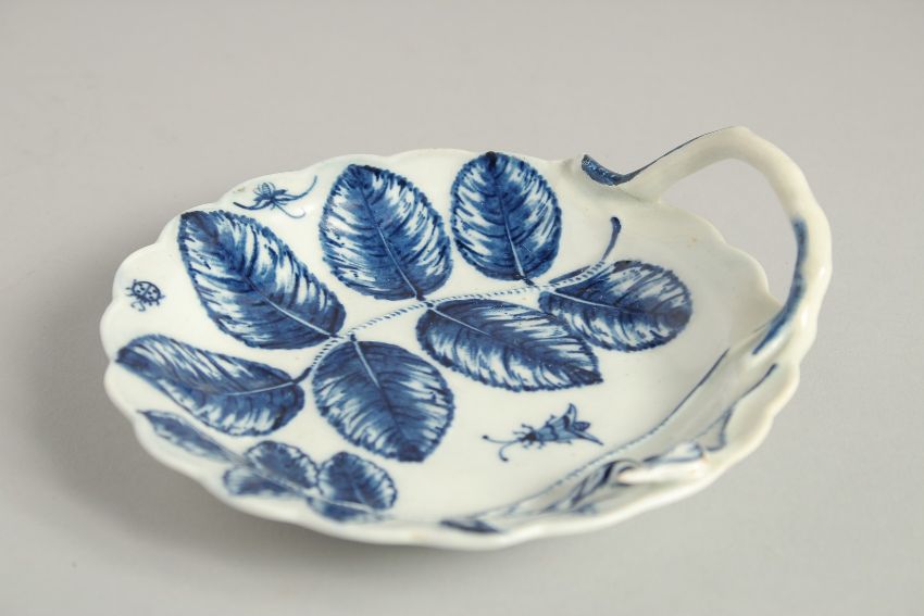 AN 18TH CENTURY WORCESTER RARE HANDLED TRAY, moulded and painted with The Blind Earl pattern, crescent mark.