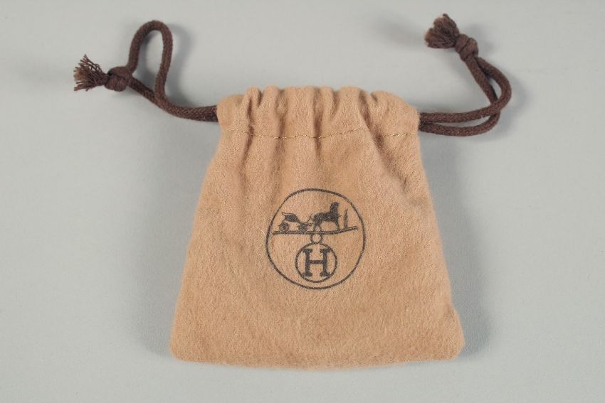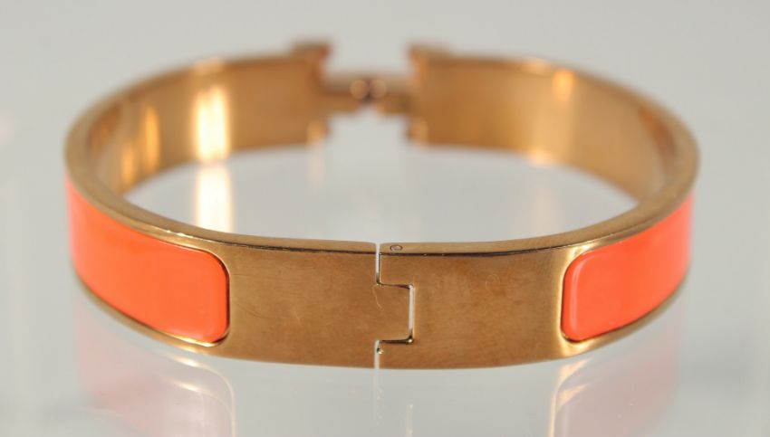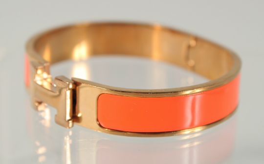 A HERMES ORANGE AND CHROME BANGLE.