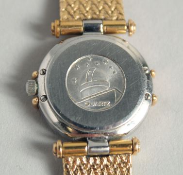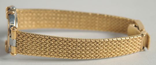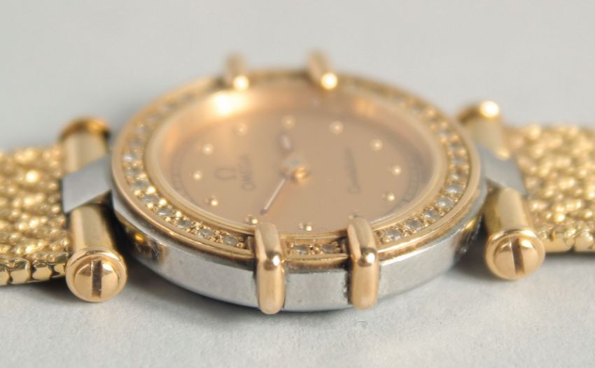 A LADIES 18CT GOLD OMEGA CONSTELLATION WRISTWATCH AND BRACELET surrounded by diamonds.