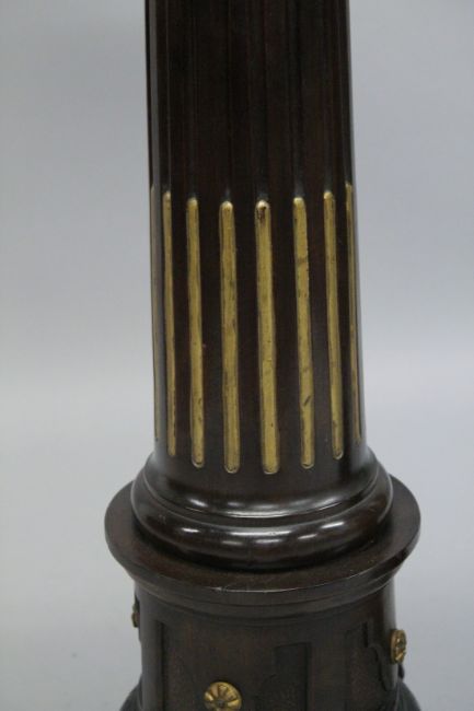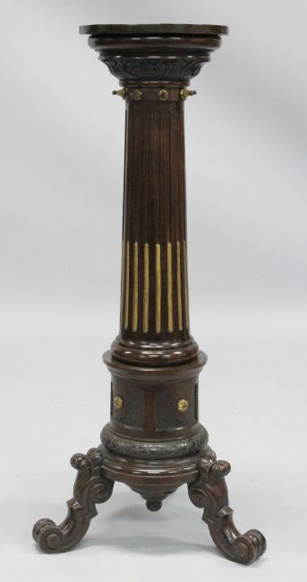 A GOOD PAIR OF 19TH CENTURY AESTHETIC MAHOGANY STANDS with circular tops gilded fluted column on three curving legs.