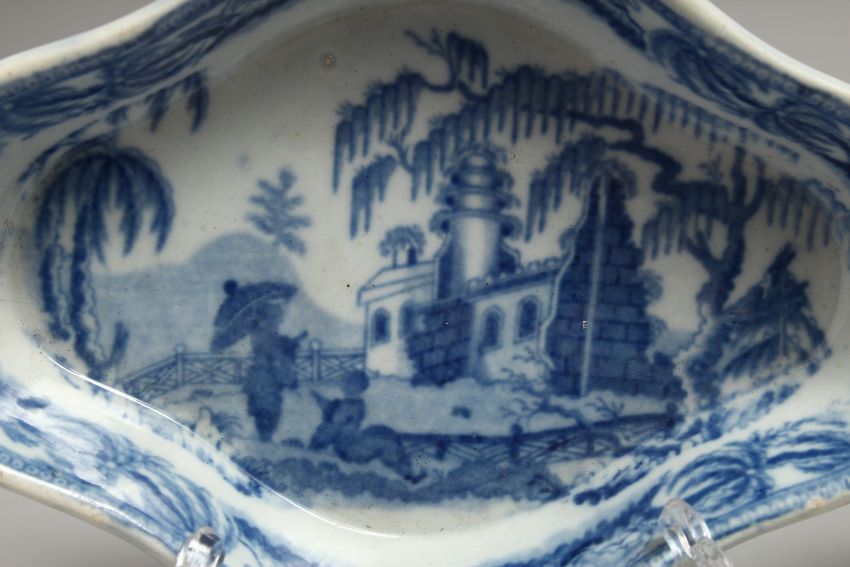 TWO BLUE AND WHITE WILLOW PATTERN DISHES.