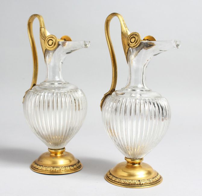 A VERY GOOD PAIR OF POSSIBLY FRENCH, CRYSTAL AND GILT METAL EWERS.