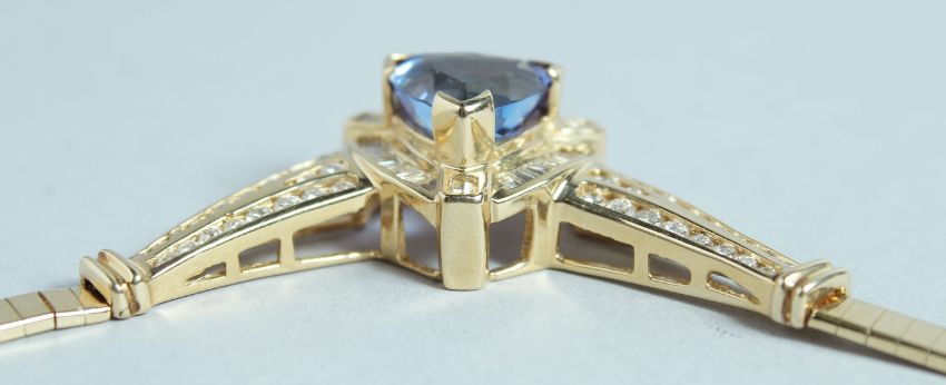 A SUPERB 14CT GOLD TANZANITE AND DIAMOND NECKLACE, purchased from Marshalls, Worksop