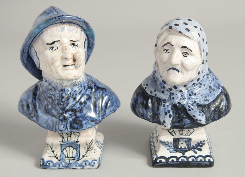 A SMALL PAIR OF DUTCH BLUE AND WHITE BUSTS OF A MAN AND WOMAN.