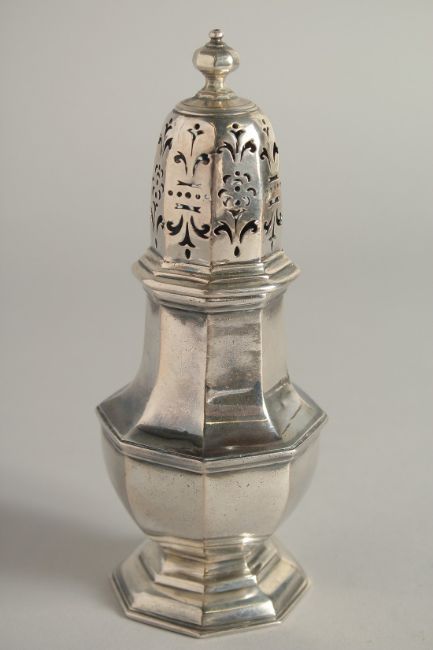 A GEORGE I OCTAGONAL SUGAR CASTOR by MATTHEW LONGMOOR.