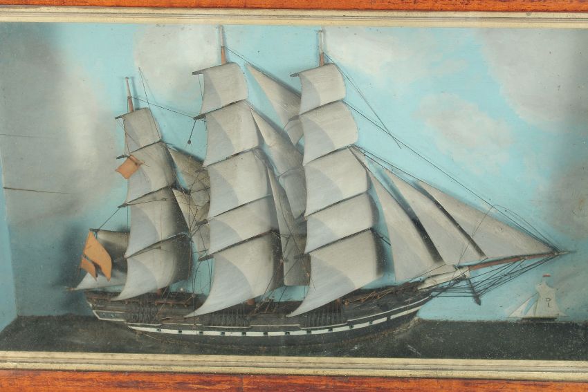 A LARGE 19TH CENTURY SAILING DIORAMA, depicting a three masted sailing ship, with painted background in a maple framed display case.