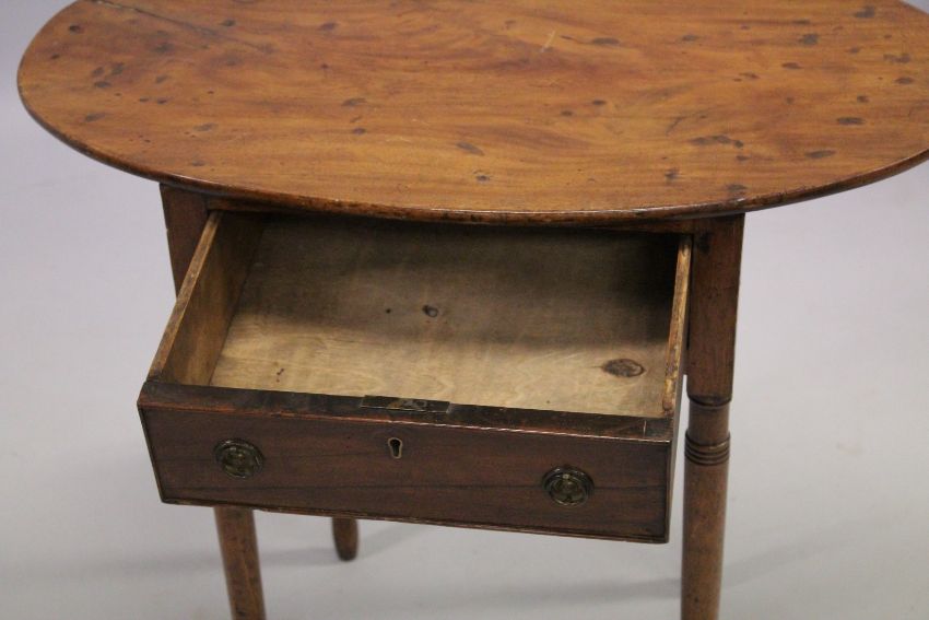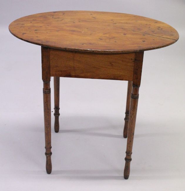 A 19TH CENTURY IRISH YEW WOOD OVAL TABLE sold by HODGES & SON, DUBLIN with plain oval top, single drawer and supported on turned legs.