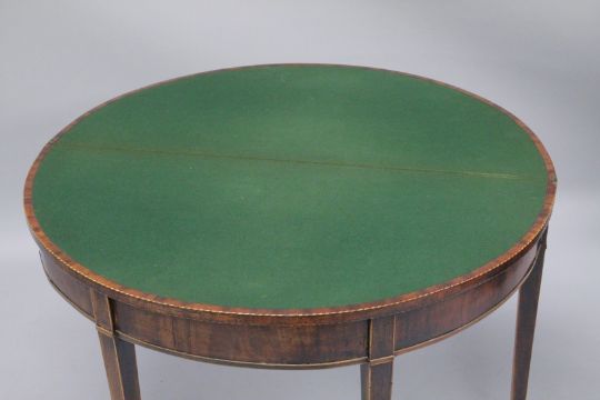 A GOOD GEORGE III MAHOGANY DEMI-LUNE FOLD OVER CARD TABLE with tapering legs.