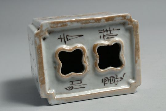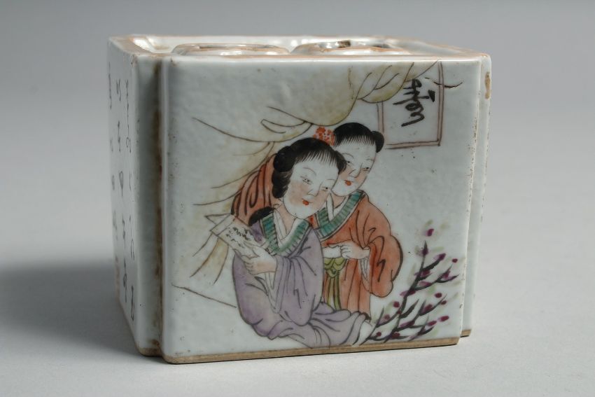 A CHINESE PORCELAIN INKWELL, painted with figures and script.