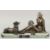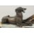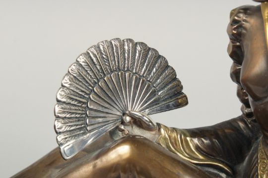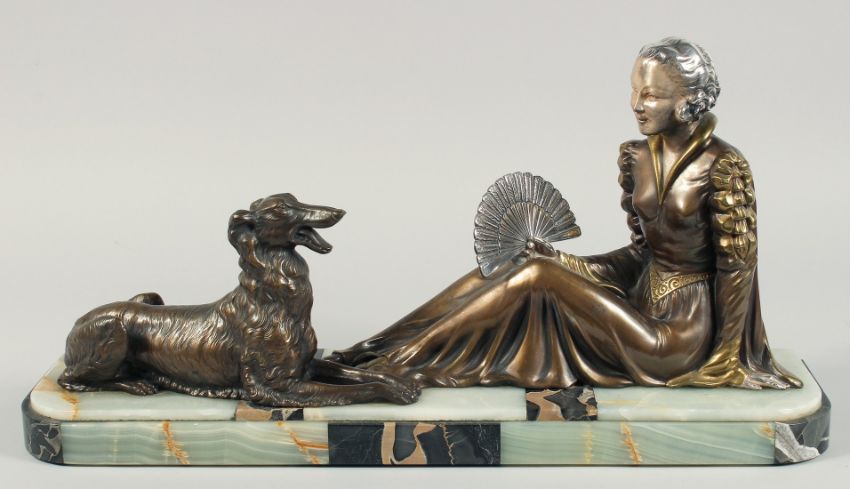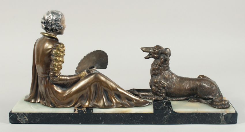 A VERY GOOD ART DECO BRONZE GROUP OF A LADY SEATED HOLDING A FAN in front of a Borzoi on an inlaid base.