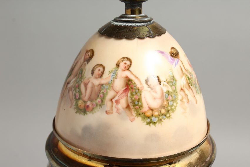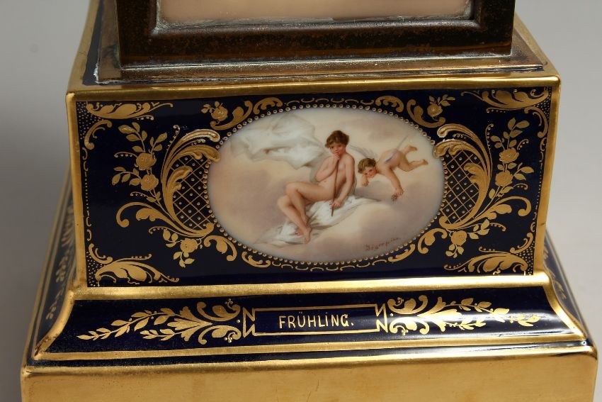 A VERY GOOD 19TH CENTURY VIENNA PORCELAIN CLOCK with metal supports and painted panels with cupids and classical scenes.