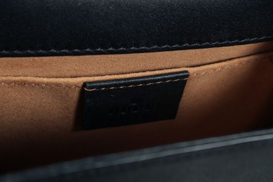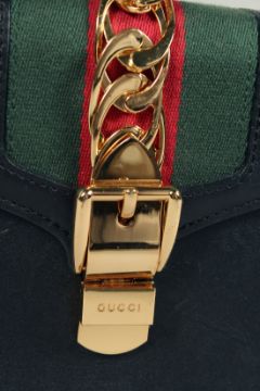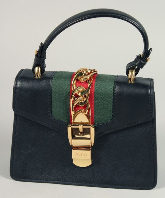 7.5ins x 5.5ins with gilt Gucci lock and leather handles.